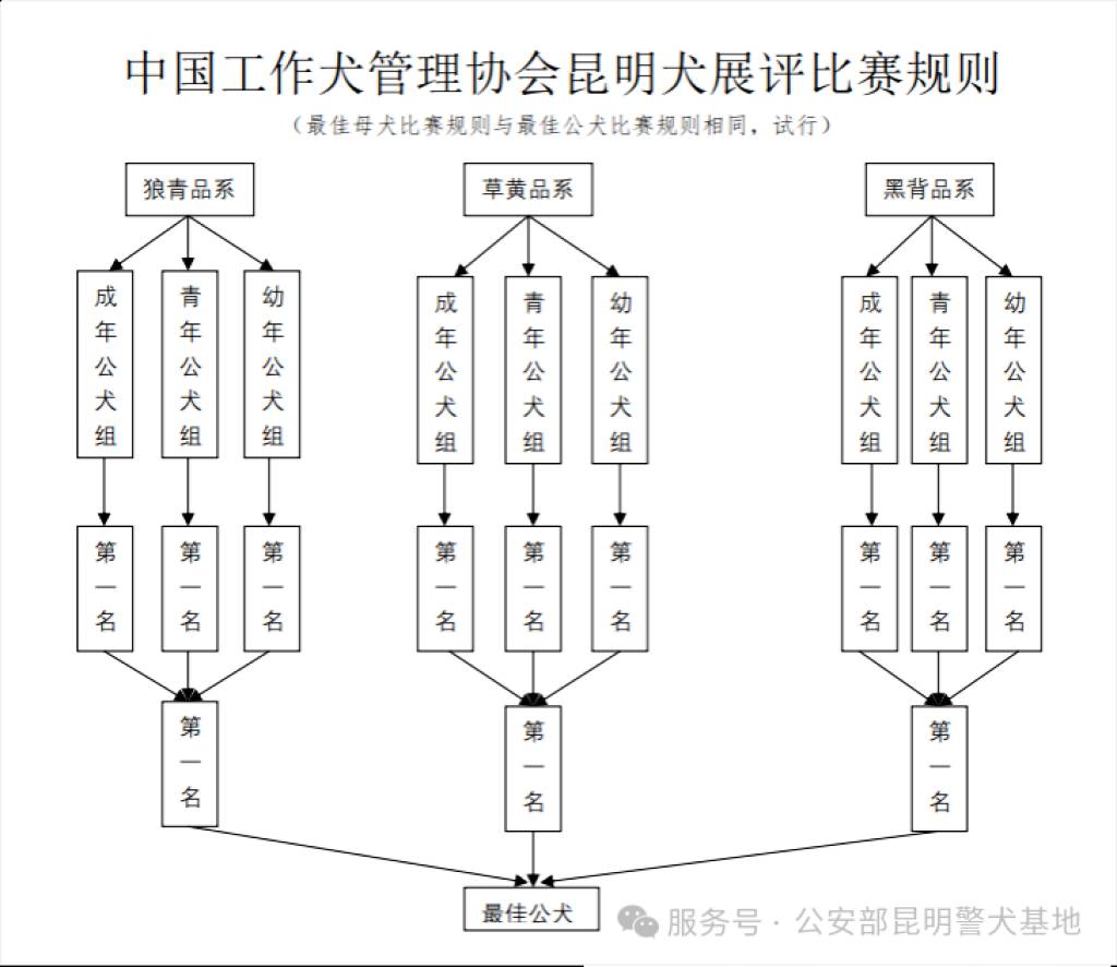 第二轮:品系赛(本性别品系组):同一品系中,各年龄组的第一名(成年、青年、幼年)进行比拼,品系第一名晋级。