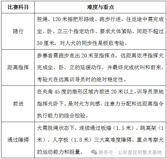 看点:比赛的科目设计贴近实战需求,重点考察犬在复杂指令下的准确性、速度与抗干扰能力。