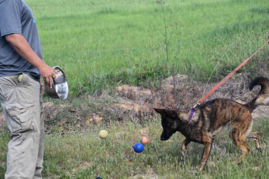 评测员A拿盆,盆内4-5个玩具,有塑料球、KONG、绳球等,评测员B负责牵犬。将盆中物品倒出,适当放松牵引,观察犬的反应。
