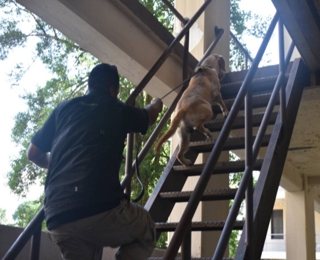 带犬上下楼梯,楼梯为一栋旧建筑物的钢架楼梯,约20阶,楼道、梯面比较窄。测试犬的胆量、运动攀爬能力,也在考察犬在面临问题时适应和学习能力。