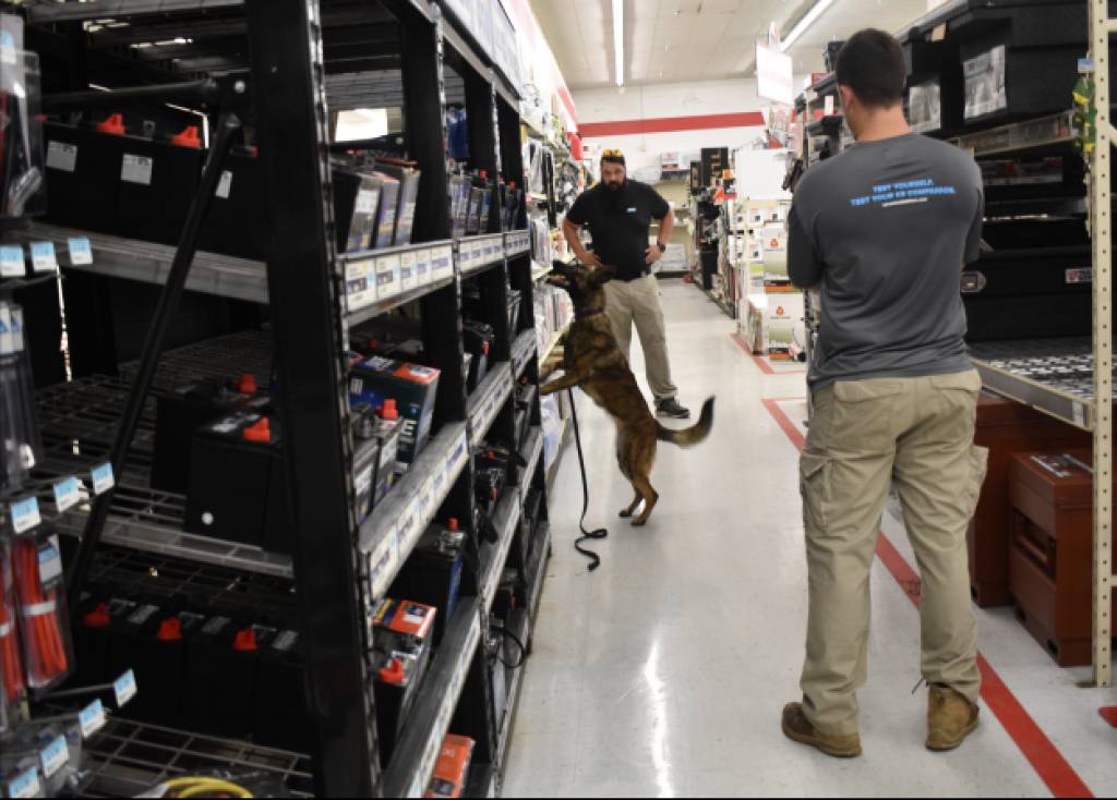 在商场做藏找,评测员B调引犬的兴奋性,把胶球抛出,评测员A把球藏在某个眼睛看不见的地方。放犬搜索,找到球后,鼓励犬,结束测试。