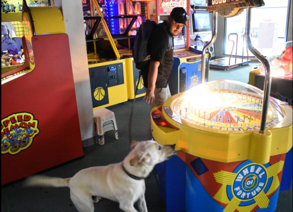 测试犬对超市环境的适应性,对孩子、陌生人的态度,特别进入游乐场,观察犬对声音、光线、摇晃台子(跳舞机等)、游戏机、狭小黑暗空间、商场人员的适应,还特别弄出各种声响来观察犬的反应。